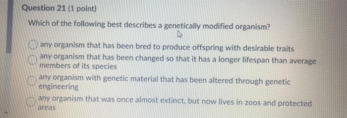 Which best describes a transgenic organism. Which of the following best describes a gene. Which best describes a transgenic organism.